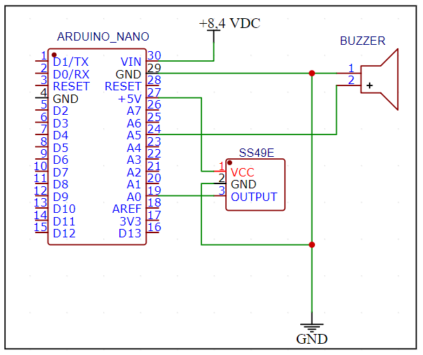 Ponieważ jest to czujnik analogowy to należy podłączyć go pod port Analogowy. W zależności do której strony dołożymy magnes to wartość będzie zwiększać lub zmniejszać jego górna granica wynosi 1000G. Zasada działania alarmu polega na tym, że podczas zamknięcia drzwi czujnik cały czas ma wykrywać obecność pola magnetycznego. Podczas gdy drzwi/kalpy zostaną otwarte arduino zlicza czas po czym uruchamia buzzer z określoną częstotliwością wydając przy tym dźwięk alarmu.