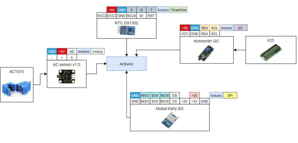 Projekt ma na celu monitorowanie wartości prądu za pomocą czujnika SCT-013, przetworzenie odczytów i zapisanie ich na karcie SD. Jednocześnie informacje o odczytach są wyświetlane na wyświetlaczu LCD. Dodatkowo, projekt uwzględnia zapisywanie najwyższej wartości prądu oraz powtarzanie zapisu na kartę SD co 60 iteracji pętli.