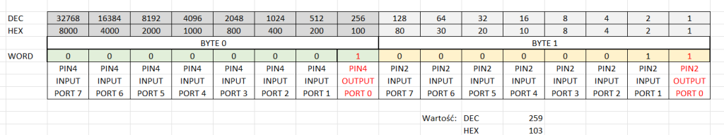 Po wyzwoleniu czujnika Pin 2 jest aktywowany a Pin 4 dezaktywowany. Stąd zapis na pierwszym BYTE.
