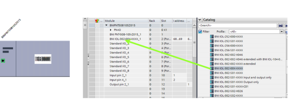 Na początku kasujemy w naszym module Standard I/O_1 i w jego miejsce przeciągamy z zakładki IO-Link device modules naszą wersje modułu w moim przypadku jest to moduł BN1 IOL-302-000-K006 dlatego wybieram BNI IOL-302-00X-XXXX (2 Byte Input and 2 Byte Output). Dla pewności można sprawdzić na stronie producenta ile pamięci/danych potrzebuje nasze urządzenie.