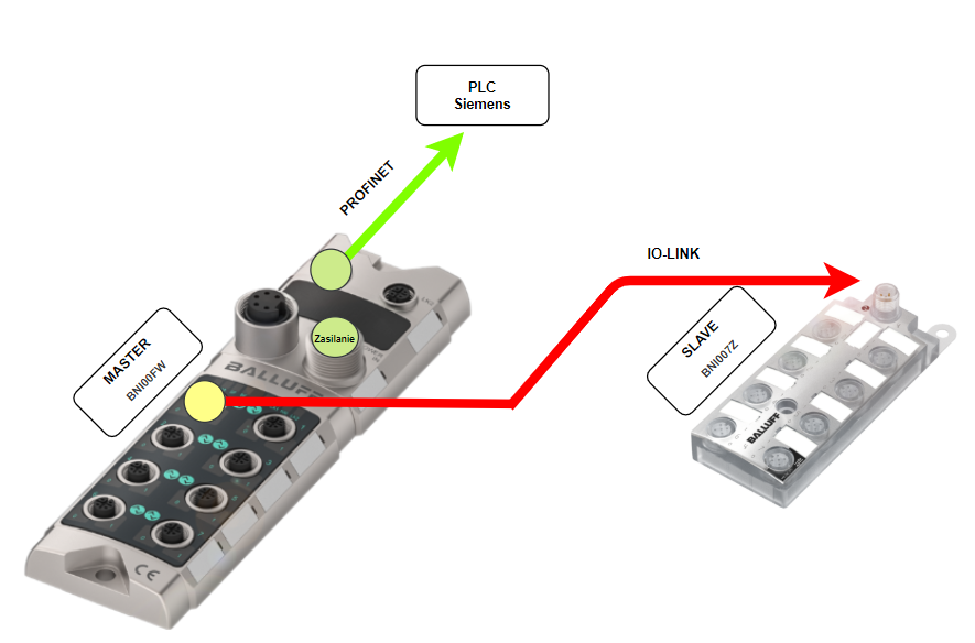 Master komunikuje się z Slavem po standardzie komunikacji IO-LINK stąd do komunikacji z nim potrzebny jest Master, który skomunikuje się z nim.