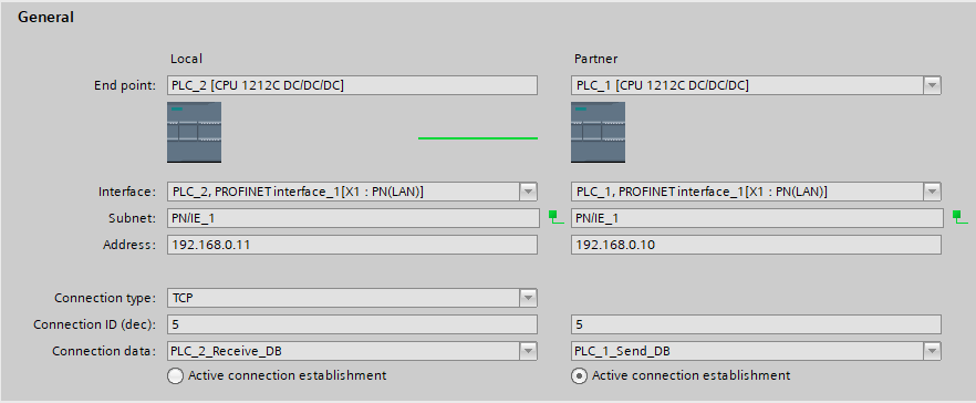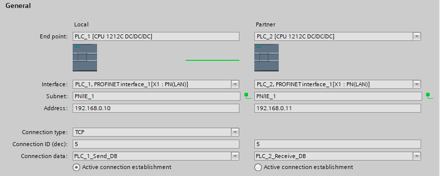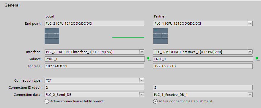 Należy połączyć oba sterowniki połączeniem” S7-connection ” oraz ustawić im inne Adresy w moim przypadku jest to PLC1 192.168.0.10 i PLC2 192.168.0.11.