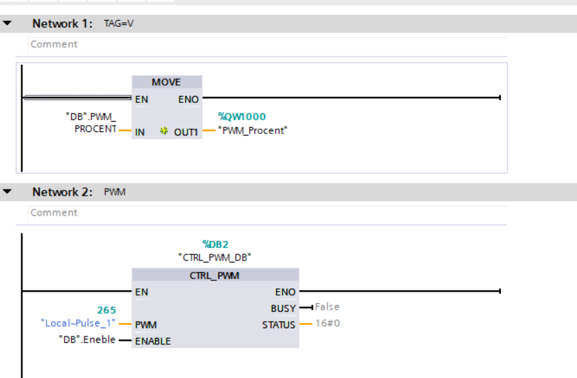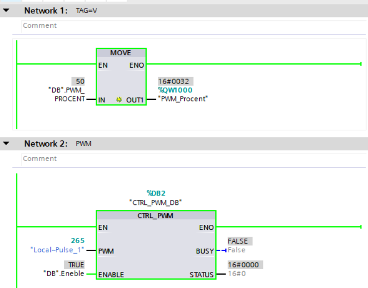 Krok 5. W OB1 Main tworzymy dwa networki w pierwszym zapisujemy przepisywanie wartości z naszego bloku DB do wyjścia przypisanego w sterowniku odpowiadający za wypełnienie sygnału w naszym PWM. w DRUGIM stosujemy bloczek CTRL_PWM który znajduje się w Instructions -> Extended Instructions ->Pulse