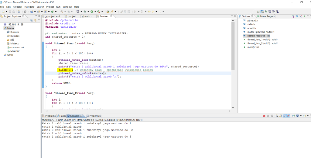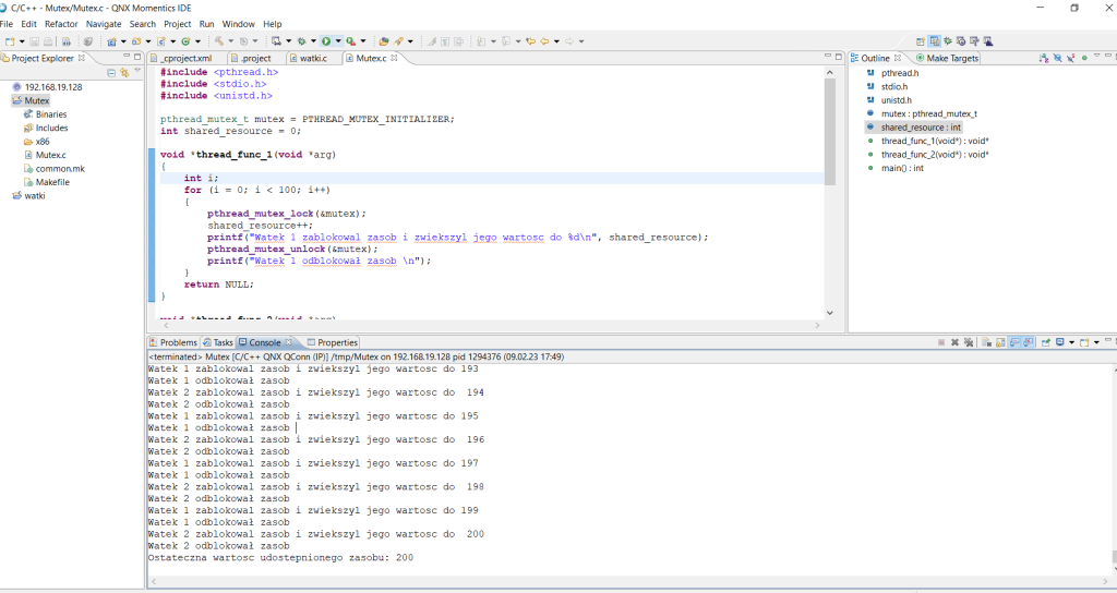 Program obrazujący działanie Mutex-ów został zrealizowany przy użyciu Systemu QNX przez środowisko programistyczne QNX Momentics IDE