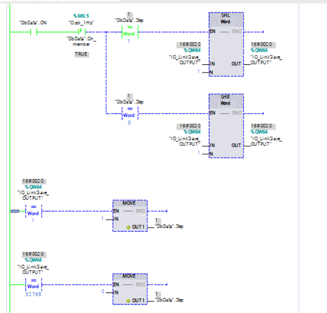 Teraz, wykorzystując bloczki SHL i SHR, można sprawdzić wszystkie wyjścia. SHL przesuwa bity w lewo, zaś SHR w prawo. Posiadając tę wiedzę, można po kolei włączać każde wyjście