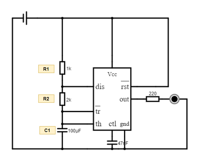 1. Piny 2 (TRIGGER) i 6 (THRESHOLD): W trybie astabilnym, piny TRIGGER i THRESHOLD są używane do kontrolowania czasu trwania stanów wysokiego i niskiego sygnału wyjściowego. Podobnie jak w trybie monostabilnym, napięcie na tych pinach jest porównywane z wewnętrznym napięciem odniesienia.