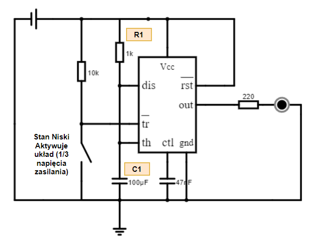 W opisanym połączeniu, układ LM555CN zachowuje się jako monostabilny multiwibrator. Gdy na wejście TRIGGER (pin 2) zostanie podane niskie napięcie (czyli niższe niż 1/3 napięcia zasilania), układ załączy się na określony czas, który można obliczyć ze wzoru czasu trwania impulsu T=1.1×RC1, gdzie R to wartość rezystancji rezystora, a C to pojemność kondensatora.