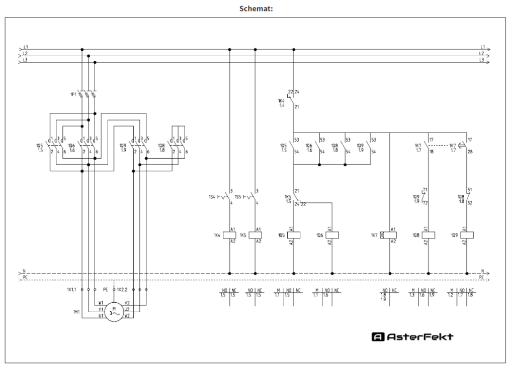 Schemat przedstawia połączenie Gwiazda-Trójkąt z możliwością zmiany kierunku.