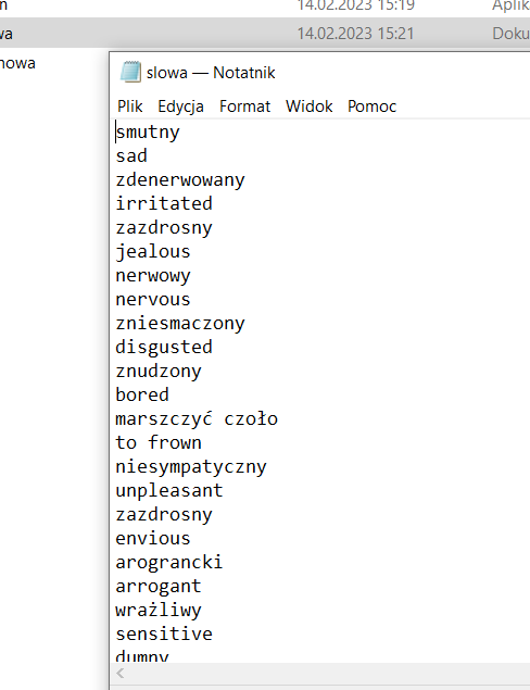Przygotowane słowa w kolejności polskie słowo i angielskie