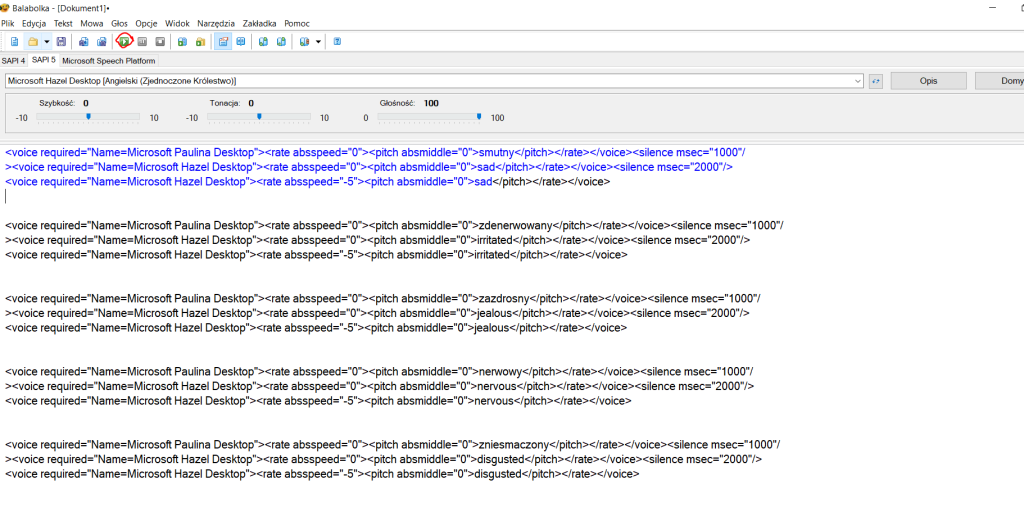 4. Następnie odczytujemy drugie słowo z pliku „slowa.txt” i ponownie zapisujemy składnię XML do pliku „wymowa.txt”. W tym przypadku w składni jest użyta inna nazwa syntezatora mowy oraz dodatkowy tag <silence>, który powoduje wstawienie przerwy o podanej długości (w milisekundach) między wyrazami.